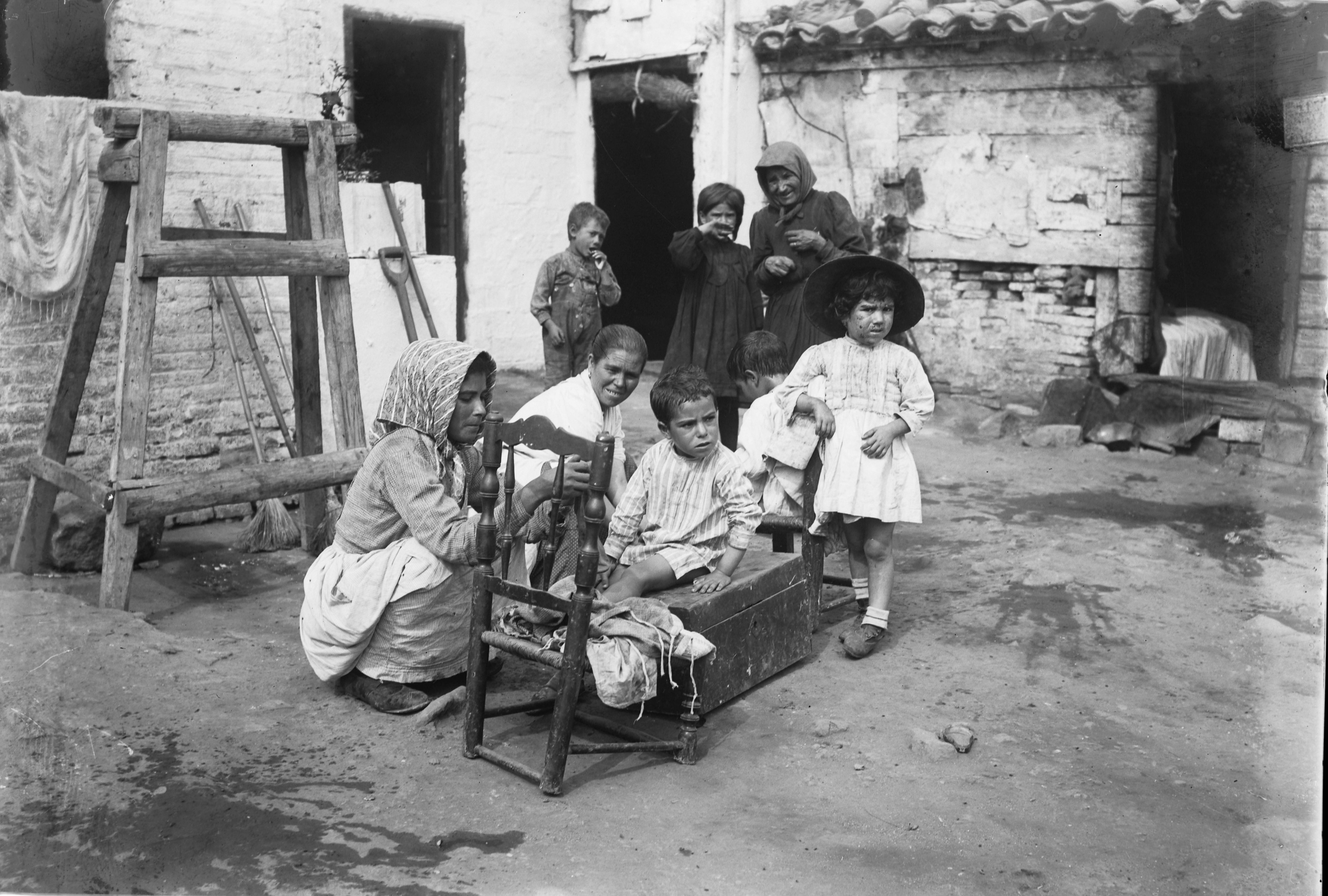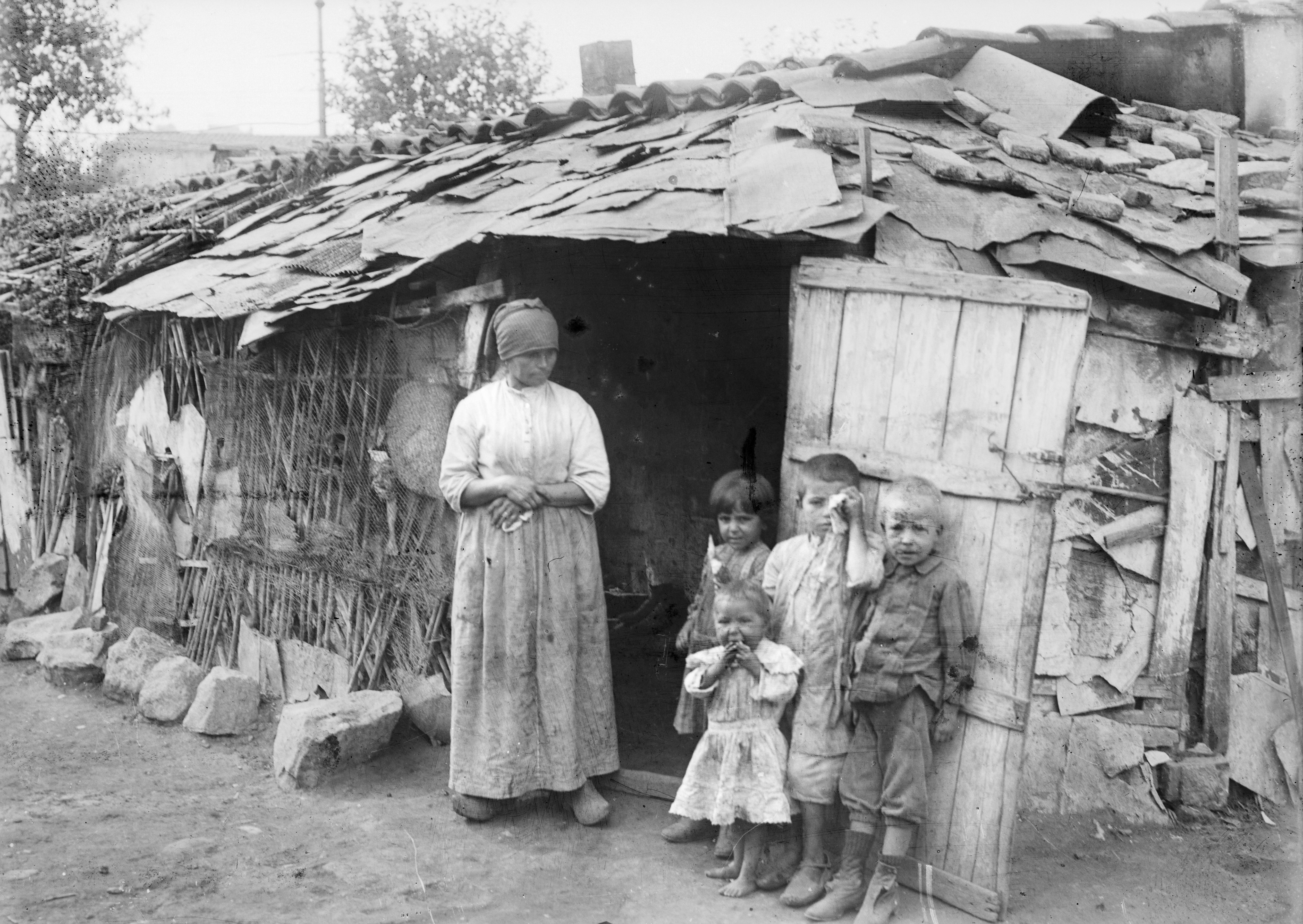 Dones i nens al carrer en un barri de barraques