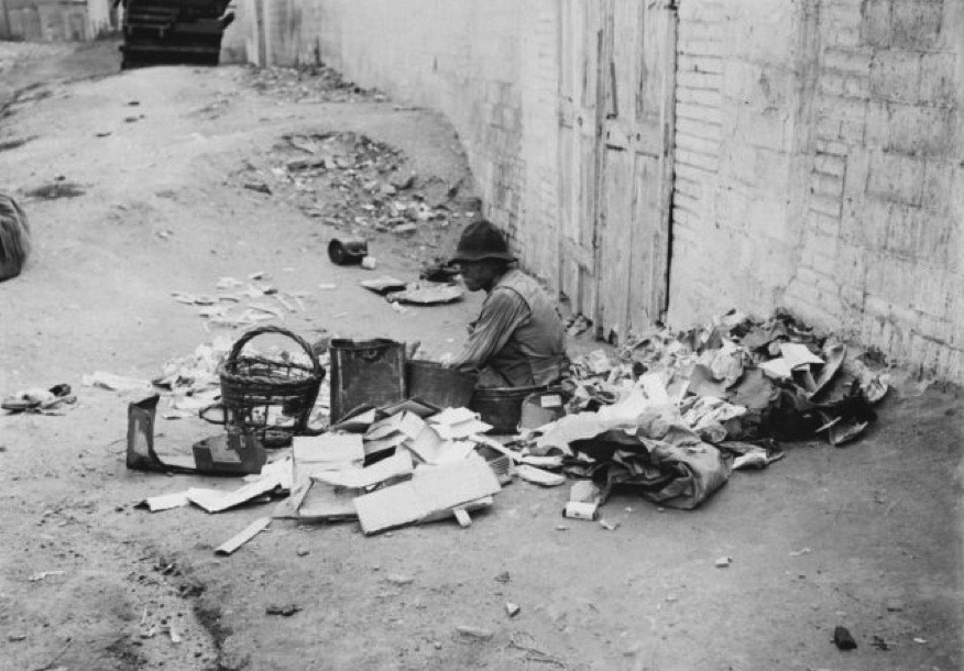Un home al terra en un barri de barraques.